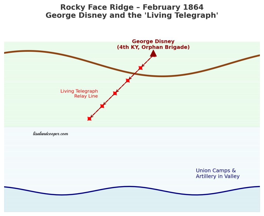 The brown ridge line marks Rocky Face. Union camps/artillery are shown in the valley below. The red dotted relay line illustrates the “living telegraph,” with arrows showing messages passed down the slope. George Disney’s position is highlighted at the summit.