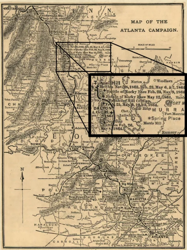 Below is the Atlanta Campaign May-September 1864 overview map, with Rocky Face Ridge marked. This map was published by the Western and Atlantic Railroad published in 1887.