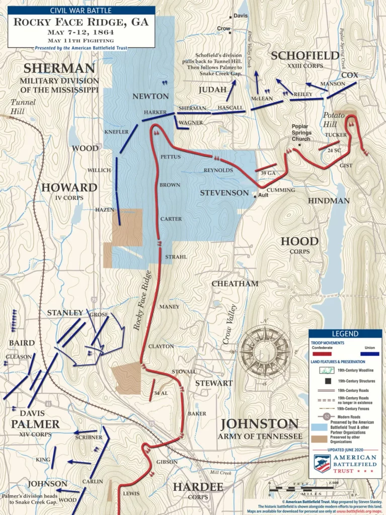 Rocky Face Ridge can be seen in the middle of this map showing placement of troops during the Battle of Rocky Face.