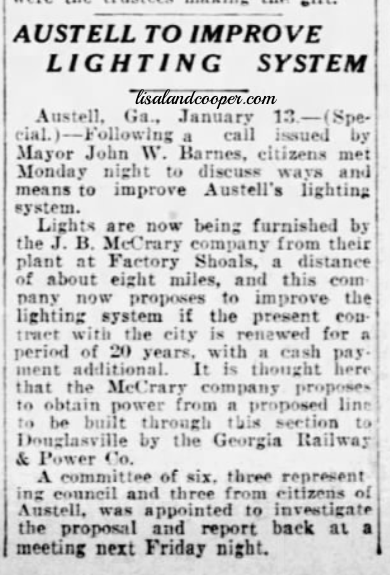 By the 1920s, J.B. McCrary, a later owner of the mill property, adapted the waterpower for other uses including supplying electricity to the nearby town of Austell.
