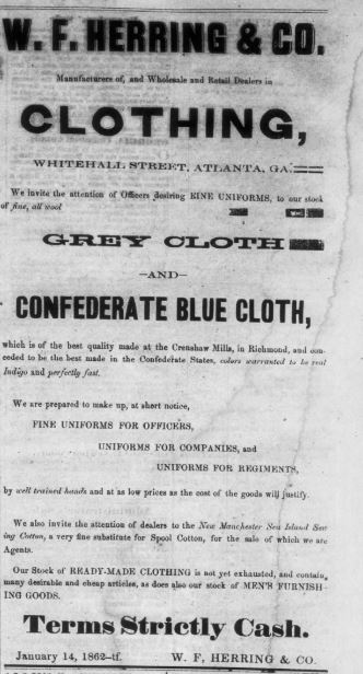 This 1862 advertisement from Atlanta merchant W. F. Herring & Co. seen below promotes “New Manchester Sea Island Sewing Cotton,” a locally produced thread offered as a substitute for imported spool cotton during the Civil War. Manufactured at the New Manchester mill on Sweetwater Creek, the product likely used high-quality Sea Island cotton—known for its long, strong fibers ideal for fine thread. As wartime shortages disrupted trade, goods like this reflect how Southern mills stepped in to supply everyday necessities once imported from the North or abroad.