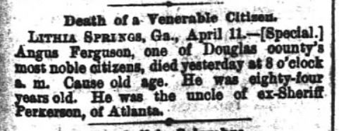 Ferguson died on April 10, 1891, at the age of eighty-four. His obituary in The Atlanta Constitution described him as “one of Douglas County’s most notable citizens” and noted that he was the uncle of former Fulton County sheriff Angus M. Perkerson.